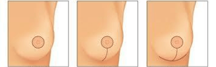 Na mastopexia com próteses é realizada a correção da ptose das mamas através da remoção do excesso de pele. Para isso são realizadas incisões nas mamas, que podem ter como resultado final uma cicatriz apenas ao redor das aréolas, ou ao redor das aréolas e uma vertical, ou ainda ao redor das aréolas com um T invertido.