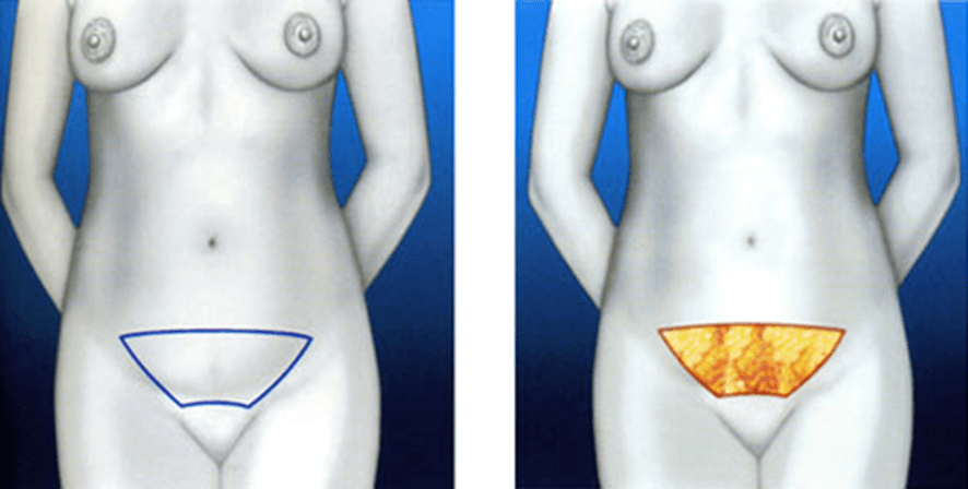 A cicatriz inferior é posicionada de forma a ficar escondida e não aparente com o uso de uma roupa íntima ou de praia, ficando quase imperceptível.
